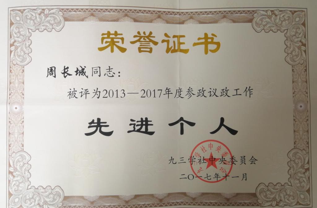 我系周长城教授获得九三学社中央嘉奖,被授予“先进个人”荣誉称号,以表彰他在过去五年里(2013-2017)参政议政工作中的突出贡献。