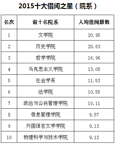 在开幕式上,图书馆根据成人直播 图书馆集成系统2014年1月1日—2014年12月30日图书外借统计数据,评选出2014年借阅图书量最高的前十名本科生及人均借阅册数最高的前十名院系。社会学系学生人均借阅册数11.53,位居全校第五;2012级雷媛同学年度借阅册数201,位居全校第六。